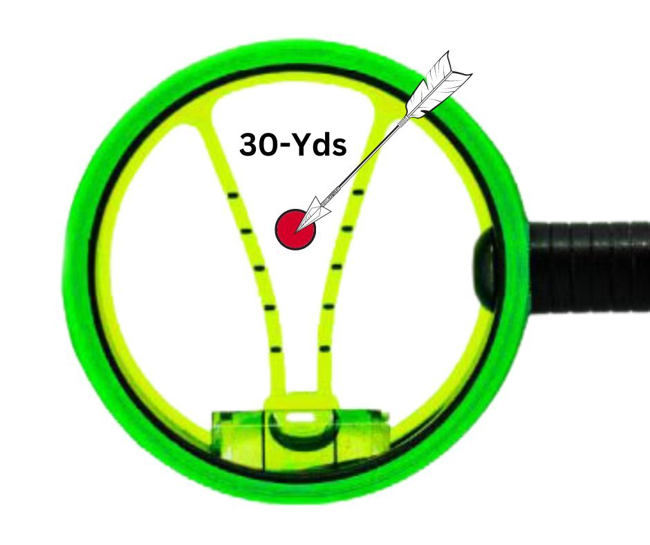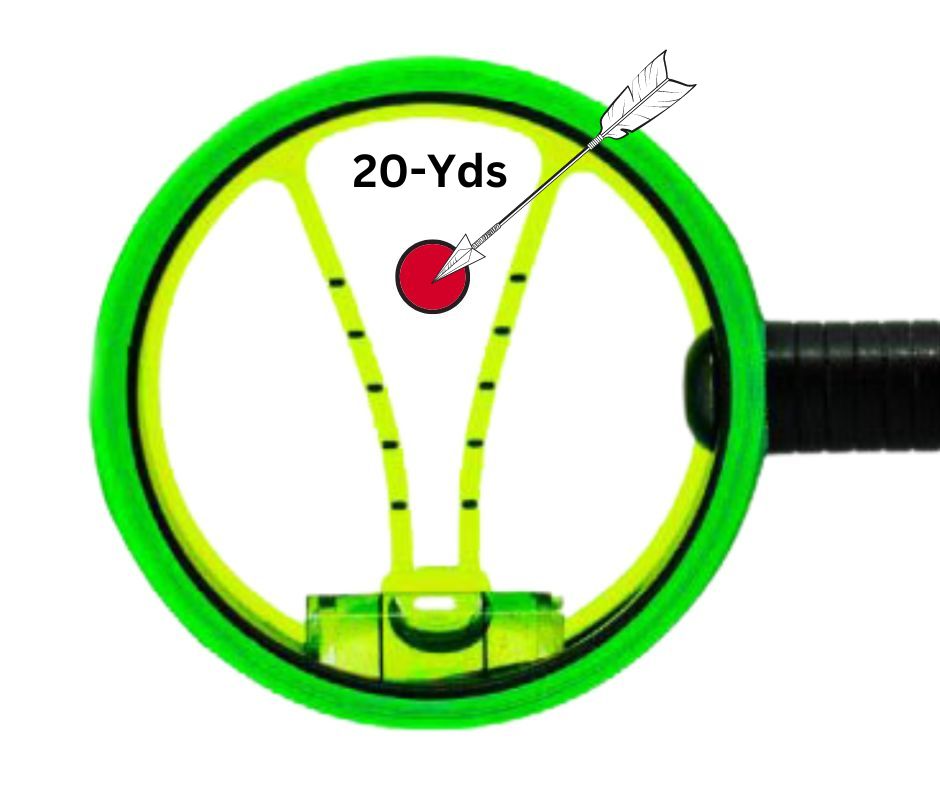 For example, if your target is a red bullseye dot at 20-yards, simply raise the “V” until the intended arrow impact point (red bullseye) is centered between the pair of 20-yd Stadia Tick Marks. (See Image P above). Your arrow will impact dead center between the pair of 20-yd Stadia Tick-Marks.